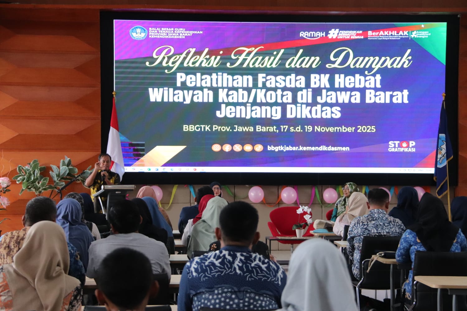 Bandung (19/11) – Balai Besar Guru dan Tenaga Kependidikan (BBGTK) Provinsi Jawa Barat melaksanakan kegiatan Refleksi Hasil dan Dampak Pelatihan Fasilitator Daerah (Fasda) BK Hebat jenjang pendidikan dasar (dikdas) selama tiga hari, mulai 17 s.d 19 November 2025 di Kampus 1 BBGTK Jabar. Kegiatan ini digelar untuk melihat sejauh mana efektivitas implementasi program 7 Jurus BK Hebat di kabupaten/kota serta merumuskan rekomendasi penguatan layanan bimbingan dan konseling (BK) di satuan pendidikan jenjang pendidikan dasar.