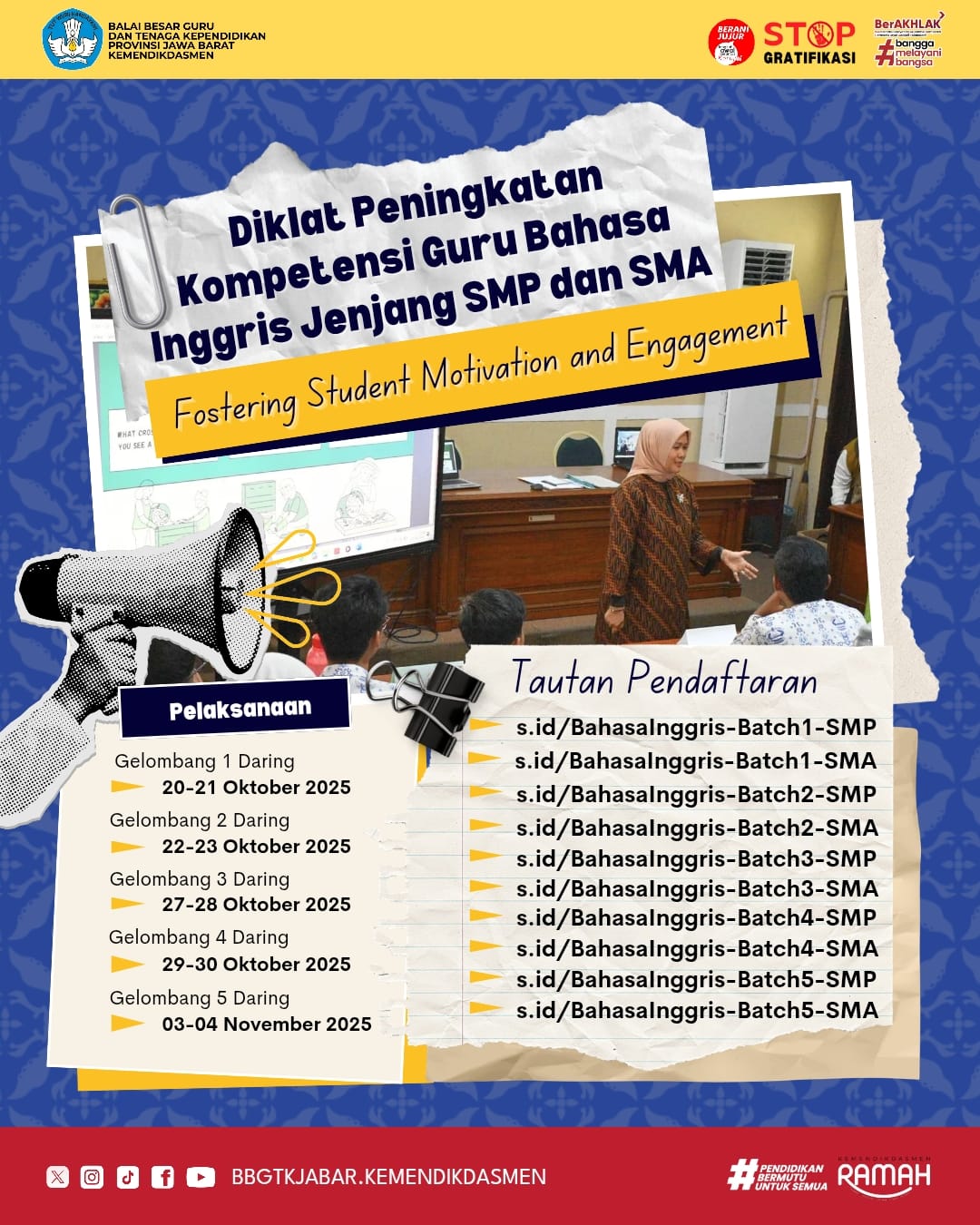 π£ BBGTK Jawa Barat membuka Diklat Peningkatan Kompetensi Guru Bahasa Inggris Jenjang SMP dan SMA dengan tema βFostering Student Motivation
