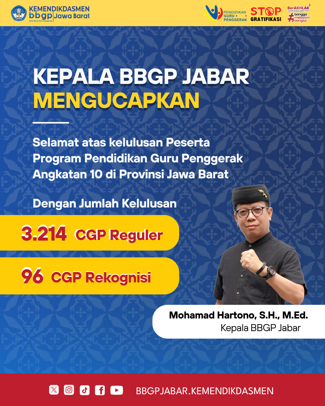 Kepala BBGP Jabar mengucapkan “Selamat” atas kelulusan Peserta Program Pendidikan Guru Penggerak Angkatan 10 di Provinsi Jawa Barat dengan jumlah