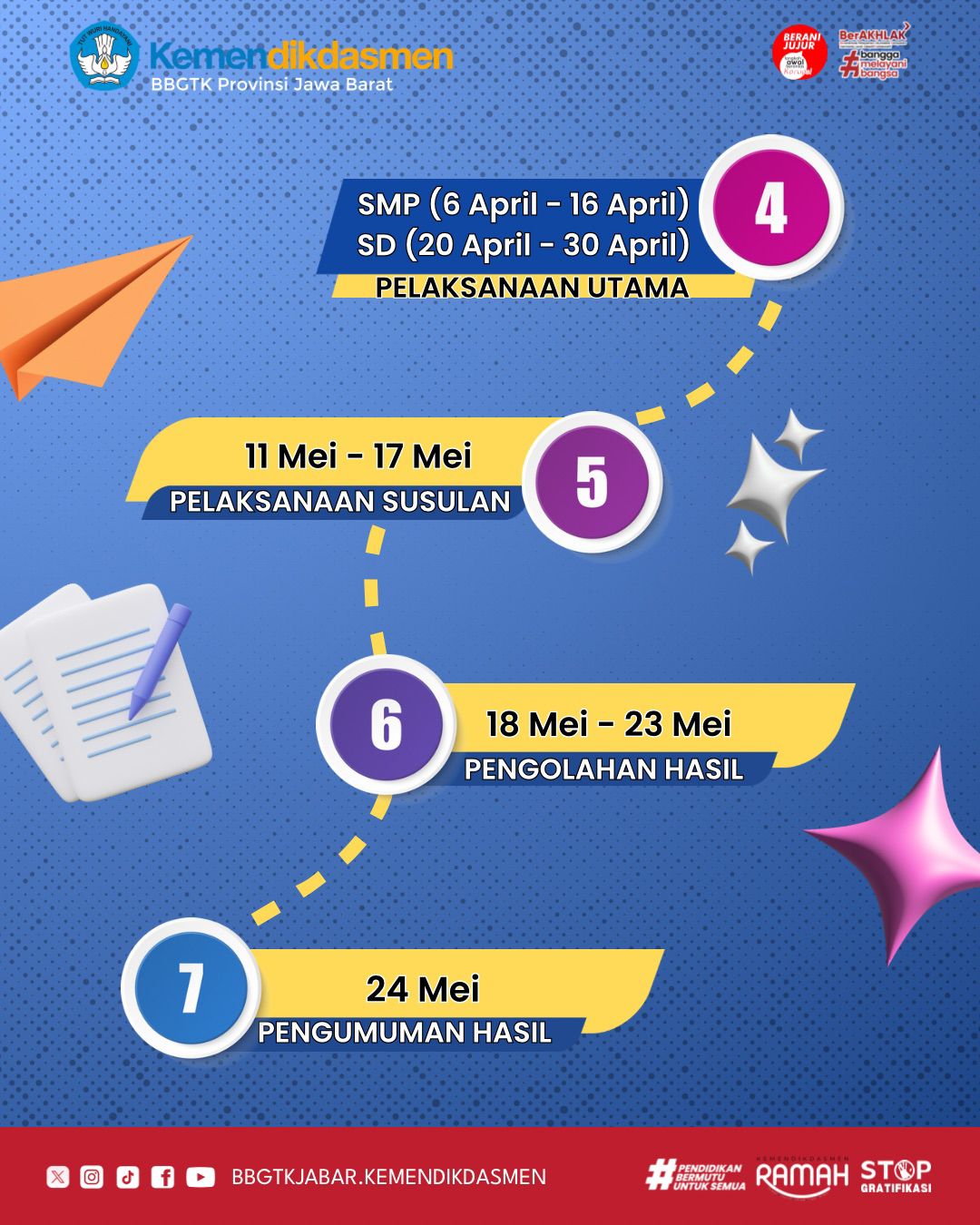 Mulai dari pendaftaran, simulasi, hingga pengumuman hasil, seluruh tahapan disusun untuk memastikan pelaksanaan TKA berjalan tertib, transparan, dan terukur. Yuk, simpan dan cermati setiap tahapannya agar tidak terlewat!