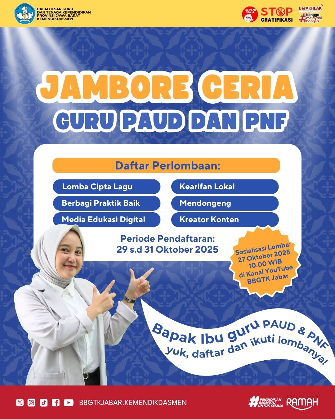 Saatnya guru-guru hebat menunjukkan kreativitas dan berbagi inspirasi! Ikuti berbagai lomba di Jambore Ceria Guru PAUD dan PNF, mulai dari: