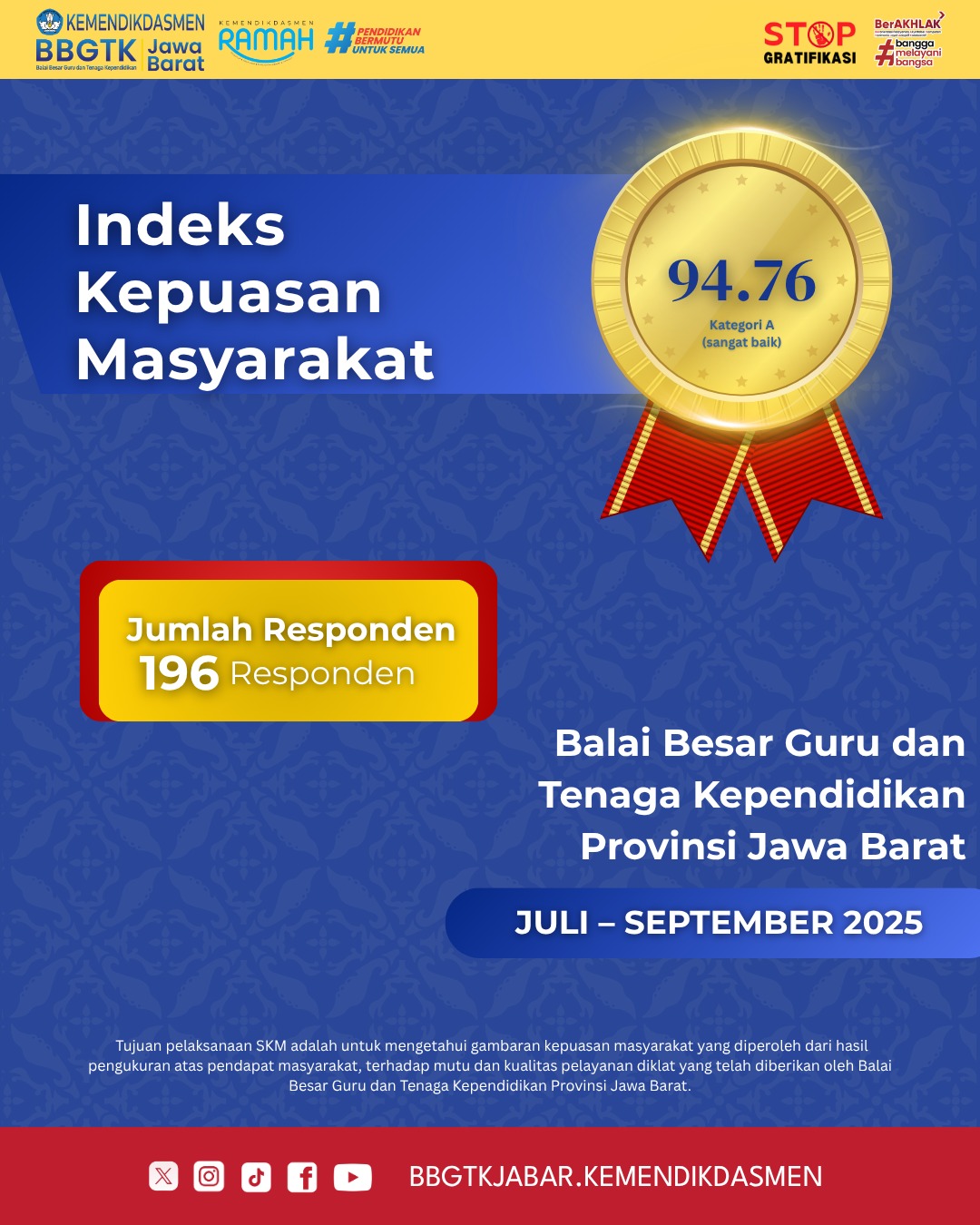 Survei Kepuasan Masyarakat terhadap Pelayanan Publik BBGTK Provinsi Jawa Barat periode Juli s.d. September 2025 telah dilaksanakan.