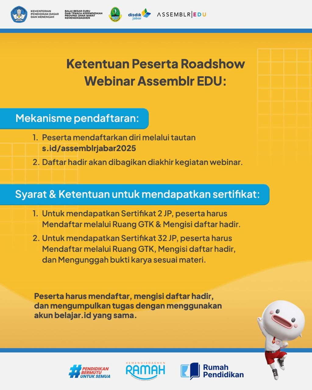 Kemendikdasmen berkolaborasi dengan Dinas Provinsi Jawa Barat dan Balai Besar Guru dan Tenaga Kependidikan Provinsi Jawa Barat menyelenggarakan Roadshow Webinar Assemblr EDU dengan judul: Pelatihan Pembuatan Flip Card Interaktif dengan Assemblr EDU.