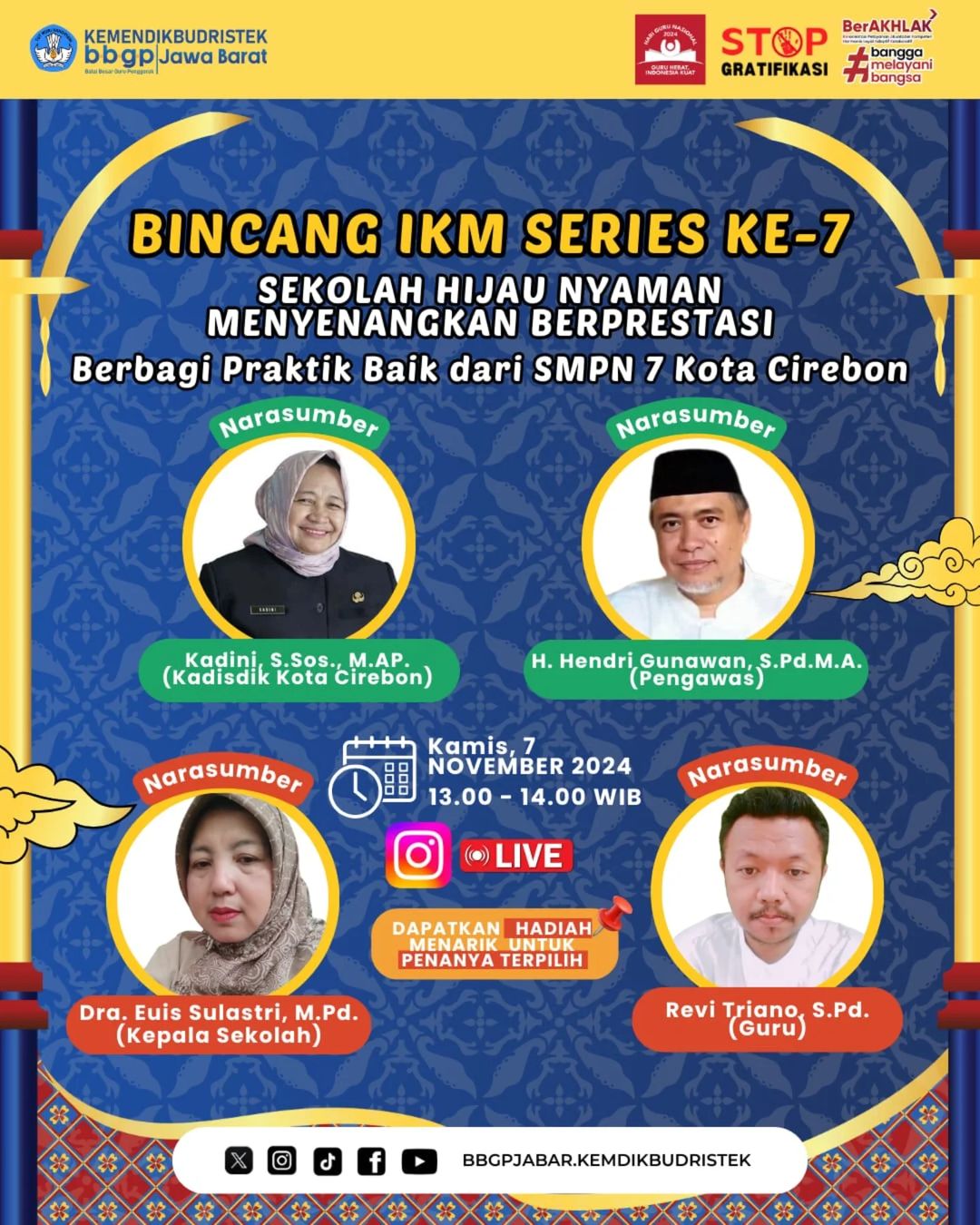 Halo Sahabat BBGP Jabar! Yuk, ikuti sesi inspiratif praktik baik dari SMPN 7 Kota Cirebon! Bersama narasumber hebat yang siap