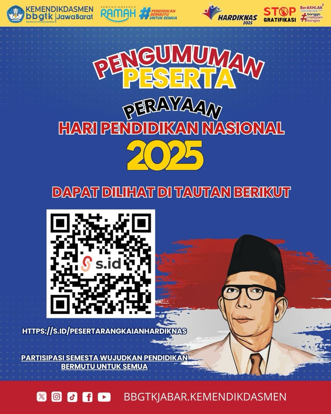 Sampurasun Sahabat BBGTK Jabar! ๐ Dalam rangka merayakan Hari Pendidikan Nasional, berikut pengumuman calon peserta Lomba -lomba Hardiknas 2025, serta