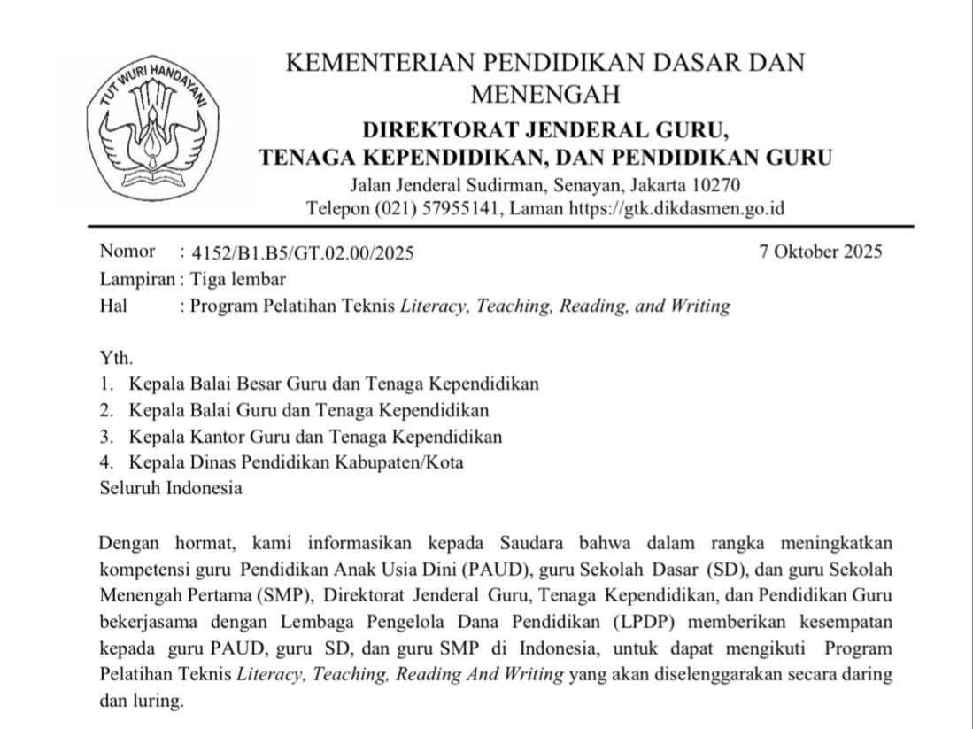 Direktorat Jenderal Guru, Tenaga Kependidikan, dan Pendidikan Guru akan melakukan sosialisasi secara daring pada hari Jum’at, 17 Januari 2025, pukul 13.30 WIB melalui kanal YouTube : Ditjen GTKPG Kemendikdasmen.